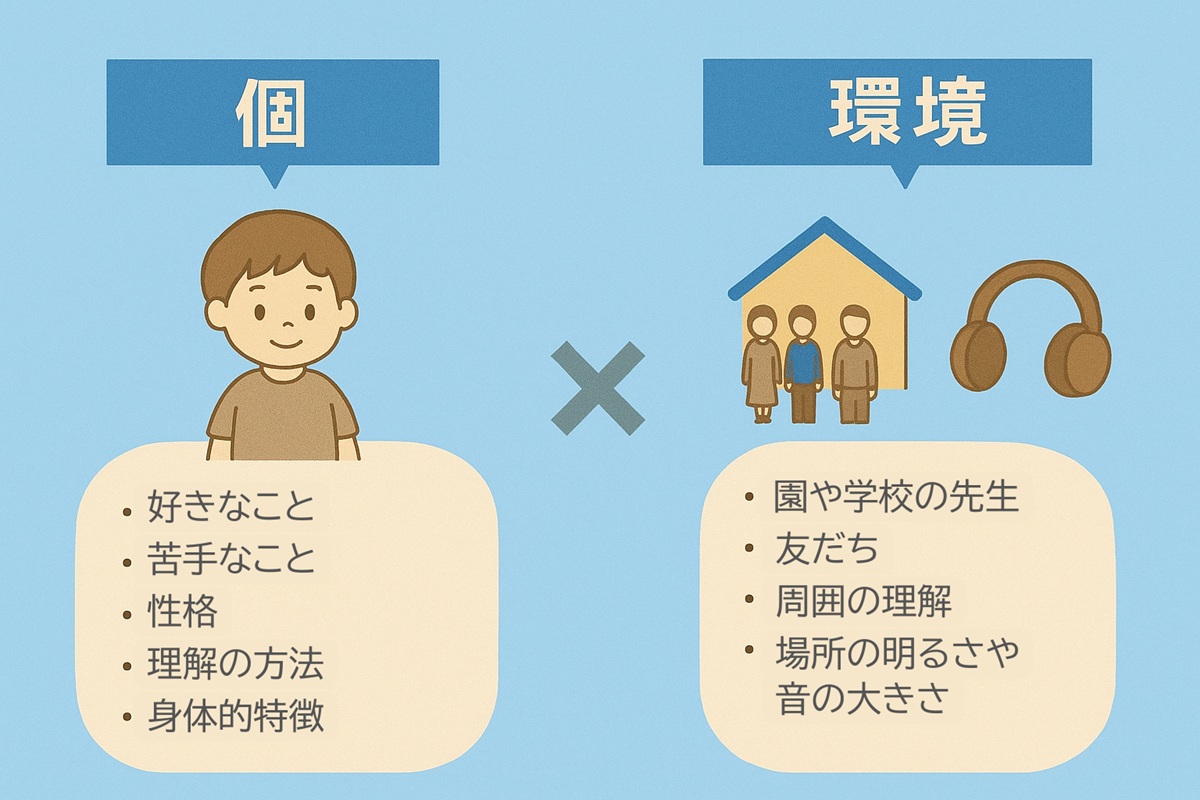 園や学校の先生やお友だちとの関わり、周囲の理解の程度、音の大きさや明るさといった過ごす空間の特性などがそれにあたります。