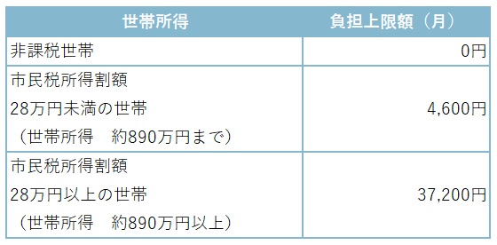 また、月々の負担上限額が世帯所得に応じて下表のように定められています。